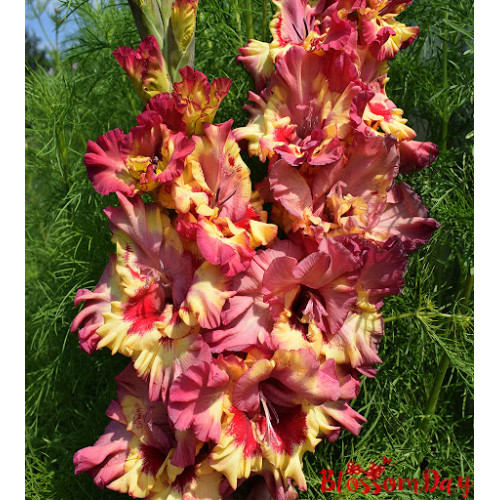 Насыщено-малиновый цветок, сильно гофрированный. На нижних желтых лепестках малиново-бардовое перистое пятно. Яркие сочные цвета.