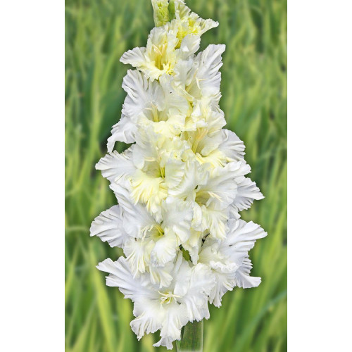 Великолепная белая супергофрированная новинка от В. Фотина. Очень Крупные, широко открытые кружевные цветки, плотно уложенные на высокий колос