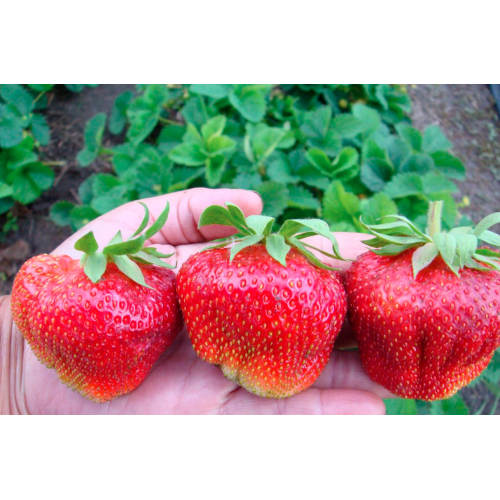 Среднепоздний сорт японской селекции. Кусты: мощные, раскидистые, высотой до 40 см, с тёмно-зелёными гофрированными листьями. Плоды округло-гребенчатой формы, ярко-красные, весят в среднем 50–80 г, а первые ягоды могут достигать 150 г. Мякоть сочная, плотная, с насыщенным сахарным вкусом и ароматом лесной земляники. Урожайность: до 2 кг с куста. Максимальный урожай достигается на 2–3-й год. Сорт выдерживает до -35 градусов, при более низких температурах саженцы рекомендуется укрывать
