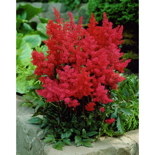 Астильба «Везувий» (Astilbe «Vesuvius») представляет собой красивоцветущее, ароматное, многолетнее растение. Высота взрослого куста составляет около 60 см, ширина до 40 см. Стебли растения ветвистые, крепкие и тонкие, покрыты небольшими, продолговатыми листьями темно-зеленого цвета. Цветки простые, мелкие (до 1 см в диаметре), окрашены в насыщенно-красный цвет.