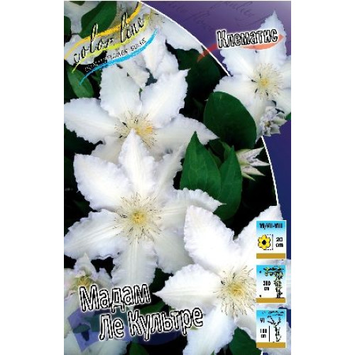 серебристо-белый, с желтыми тычинками и волнистыми лепестками. Н 300см, Обрезка: VI, 100см, Цветение: 6 / 7-8, 20см