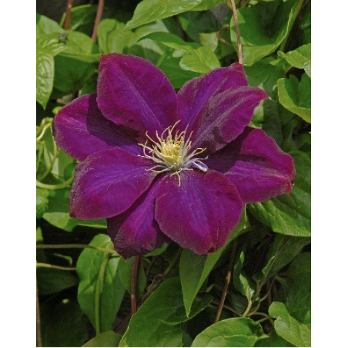 пурпурный, бархатный, контрастные кремовые тычинки. Н 200-300см, Обрезка: III, 30см, Цветение: 6-8, Ø 18см