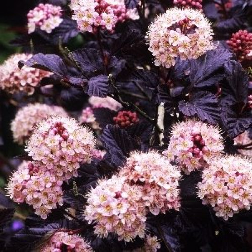 Пузыреплодник калинолистный Ред Барон (Physocarpus opulifolius Red Baron) - раскидистый кустарник до 2м высотой и таким же диаметром. В молодом возрасте растет вверх, позже ветви дугообразно изгибаются. Листья 3-5 лопастные, овальные, длиной до 7 см, зубчатые, темно–красные, уже чем у сорта пузыреплодника Диабло. В тени листва зеленеет. Цветет в июне-июле, бело-розовыми цветками, собранными в щитковидные соцветия диаметром до 5 см, которые очень эффектно смотрятся на фоне темной листвы. Красные плоды созревают в августе - сентябре, представляют собой вздутые листовки, долго держатся на кусте. Растет быстро. Нетребователен к почве. Хорошо растет на солнце и в тени, но теряет при этом яркий свой окрас . Нечувствителен к загрязнению и сильным ветрам. Зимостоек.