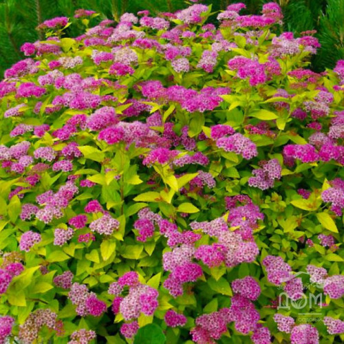 Невысокий кустарник с длительным цветением. На протяжении всего сезона сохраняет жёлтый окрас листьев. Цветки ярко-розовые, собраны в щитки