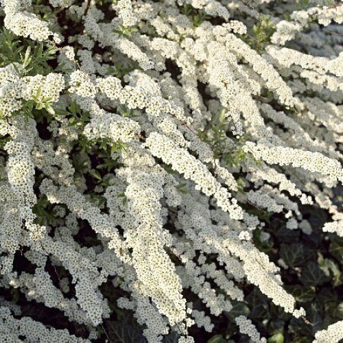 Куст с поникающими побегами. Листья тускло-зелёные, цветы белоснежные, цветут до распускания листьев весной