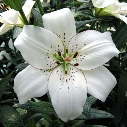 Высота растения 110 см. Цветки белоснежные с мелким крапом по центру. Диаметр цветка – 12-16 см, сроки цветения – июнь-июль.