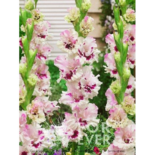 Гладиолус Мезья - высота взрослого растения 100-120 см. Цветок гофрированный, белый с розовым румянцем и пурпурным пятном.