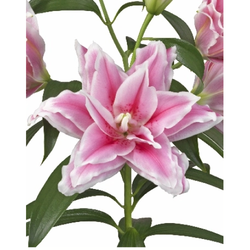 ГУСТОМАХРОВЫЙ нежно-розовый с белой каймой и малиновыми линиями посередине лепестков и крапом, без пыльцы, H-110см