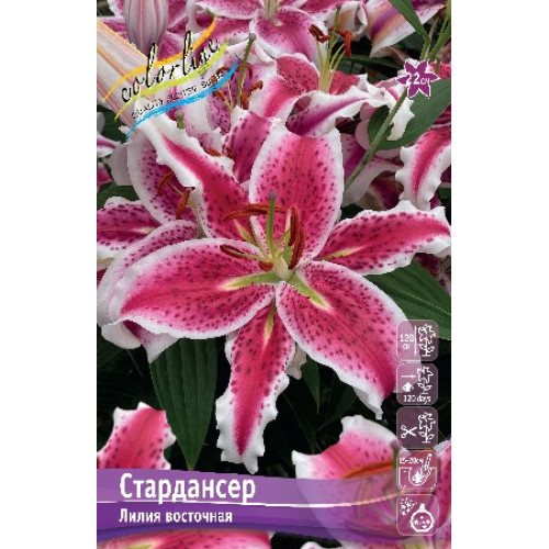 пурпурный с белой широкой каймой и темно-пурпурным частым крапом по всей поверхности лепестков, гофре по краю, H-120см