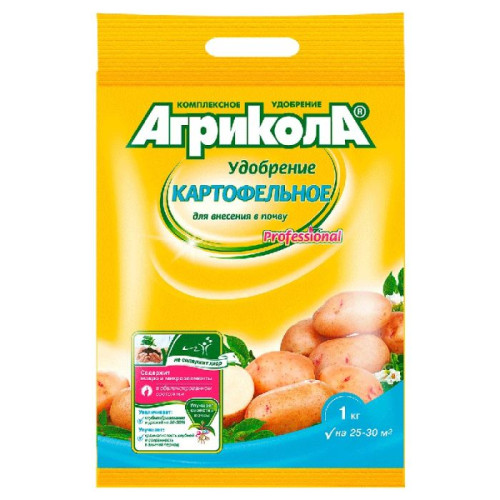 Удобрение Агрикола Картофельное - комплексное минеральное гранулированное удобрение с микроэлементами для внесения в почву. Массовая доля питательных веществ: азота (N) - 11%, фосфора (P2O5) - 9%, калия (К2О) - 16%. Содержание элементов питания подобрано с учетом потребностей растений. Не содержит хлор, который отрицательно влияет на растения. Увеличивает клубнеобразование, урожай на 20-30 %. Улучшает крахмалистость клубней и сохранность в зимний период