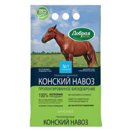 Предназначено для естественного восстановления и повышения плодородия почвы, обеспечения сбалансированного питания и формирования мощной корневой системы растений, приживаемости рассады, а также ускорения сроков созревания урожая. Конский навоз является самым питательным по содержанию минеральных веществ: NPK, микроэлементы (медь, цинк, марганец) в легкоусвояемой форме, природные стимуляторы роста