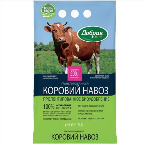 Предназначено для естественного восстановления и повышения плодородия почвы, обеспечения сбалансированного питания и формирования мощной корневой системы растений, приживаемости рассады, а также ускорения сроков созревания урожая. Коровий навоз содержит минеральные вещества: NPK, микроэлеменаты (медь, цинк, марганец) в легкоусвояемой форме и природные стимуляторы роста. Для всех видов растений сада и огорода: плодовых деревьев и кустарников, овощей и декоративных растений, цветов, рассады. Коровий навоз гранулированный Добрая Cила произведен по современным технологиям, которые обеспечивают важные преимущества перед обычным компостом: Удобрение не имеет резкого запаха. Его удобно использовать, равномерно вносить по участку. При длительном хранении удобрение не меняет своих свойств. Важно! Смешивать органические удобрения (коровий навоз) с золой нельзя. При смешении происходит выделение азота в виде аммиака, что значительно уменьшает эффективность внесения навоза