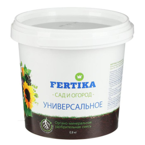 Органо-минеральное удобрение. Фертика Универсальное (NPK 8:8:8 + микроэлементы) 0,9кгОргано-минеральная удобрительная смесь с 18% содержанием гумата для основного внесения и подкормки в период вегетации овощных, плодово-ягодных, цветочно-декоративных культур, комнатных и садово-парковых растений в открытом и защищенном грунте. Каждая гранула смеси содержит полный сбалансированный набор макро- и микроэлементов питания, необходимых для нормального роста и развития растений.Расход рабочего раствора: 40-50 г на кв.м или 10-15 г в лунку.Подкормка. Расход рабочего раствора: 2-3 раза за сезон с интервалом 10-20 дн. по 15-50 г на кв.м. Полив. Расход рабочего раствора: 15-50 г на 10 л воды. Поливать растения как при обычном поливе.NPK: N (Азот) - 8; P (Фосфор) - 8; К (Калий) -8