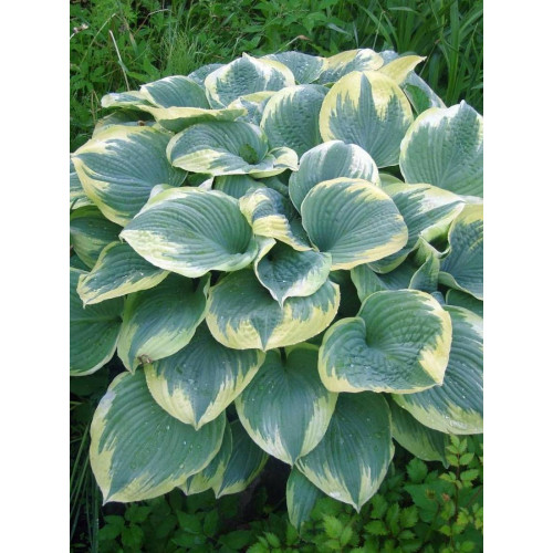 Хоста Robert Frost (Роберт Фрост). Листья округлые, темные, сине-зеленые с желто-кремовой каймой, которая становится почти белой в конце сезона. Цветет бледно-лиловыми цветами. Цветоносы высокие, до 90 см высотой. Сорт предпочитает тень или полутень.