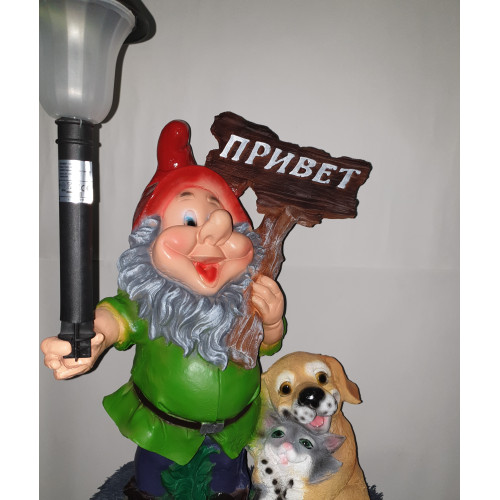 Гном с табличкой "Привет", щенком и фонарем 59х42 (Полистоун)