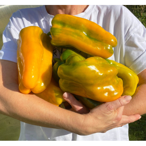 Крупные четырехкамерные перцы внушительных размеров с очень толстыми стенками. ДОСТИГАЮТ 30 СМ В ДЛИНУ И 12 СМ В ДИАМЕТРЕ. Плотные, сочные, хрустящие. По мере созревания окрас меняется, образуя красивые мраморные переливы. Куст мощный, с короткими междоузлиями, поэтому много боковых кистей, а значит, очень много перцев. Урожай будет долгим и обильным. Гибрид без устали плодоносит весь перечный сезон, грозя накрыть гигантской лавиной урожая. Для выращивания в теплице