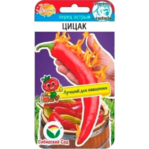 Плоды имеют вытянутую, немного загнутую на конце форму. Конусообразные плоды мясистые, покрыты гладкой кожицей. Весят перчики до 60 г, а в длину вырастают до 25 см. Вызревают плоды в промежутке от 110 до 130 дней после высадки. Цицак – урожайный перец, в среднем с 1 м² собирают 2-4 кг острых плодов. Плоды имеют разную окраску в зависимости от степени зрелости – от зеленых и желтых до набирающих остроту красных. Перец Цицак – жгучий, ароматный сорт, имеющий приятную сладковатую ноту, которая смягчает остроту. Поэтому его можно употреблять сырым. Употребляют свежими, маринованными или солеными, сушеными (растерев их в пыль и используя в качестве приправы).