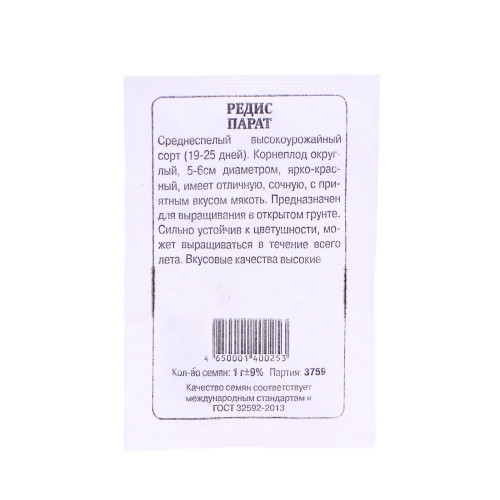 Среднеспелый сорт (18-25 дней). Корнеплод круглый, диаметром 5-6 см, с ярко-красной поверхностью. Мякоть сочная, нежная, с приятным вкусом. Сорт предназначен для открытого грунта