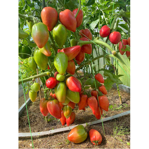 Шикарные грозди спелых розовых перцевидных помидоров типа Корнабель потрясающего десертного вкуса. Гибрид ранний, поспевает одним из первых. Полудетерминантный, а это значит, что его можно формировать в 2–3 стебля, тем самым колоссально повышая урожайность. Куст энергичный с короткими междоузлиями. Активно завязывает плоды. Урожайность очень высокая. Генетически устойчив к вертициллезному увяданию и высокоустойчив к другим заболеваниям