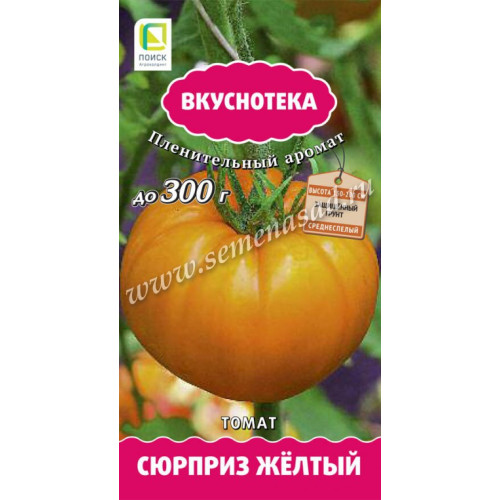 Красивый яркий цвет. Мягкий тонкий вкус. Среднеспелый сорт для пленочных теплиц. Период от всходов до созревания 115-120 дней. Растение высокорослое, требует формирования и подвязки. Крупные плоды, плоскоокруглые, ребристые, жёлто-оранжевого цвета. Масса 200-250 г, до 300 г. Отличный вкус. Для употребления в свежем виде и приготовления соусов