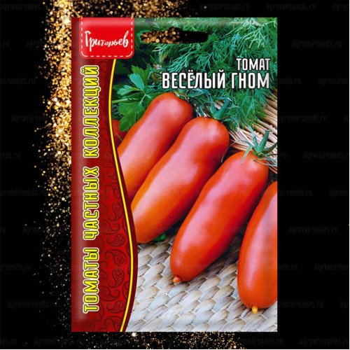 Раннеспелый (срок созревания 90-100 дней), низкорослый (высота куста 40-50 см) сорт. Его можно выращивать в открытом грунте, в небольших плёночных теплицах и на балконе. Крона небольшая и компактная. Стебель толстый и крепкий. Крону и плоды он держит хорошо, но из-за активного созревания томатов необходимо подвязывание. Форма цилиндрическая, вытянутая и с носиком (иногда носик вдавлен вовнутрь). Вес плодов около 80-90 г, длина 12-15 см. Кожура гладкая и не растрескивается. Оттенок зрелого плода - красный, незрелого - светло-зелёный. Мякоть плотная, сахаристая и мясистая, бледно-розового оттенка. Внутри одна камера, семян немного. Томаты универсальные, поэтому подойдут для употребления в свежем виде, для консервации и замораживания. На одном кусте созревает от 1,5 до 2 кг, с 1 м² можно снять 5,4 кг томатов.