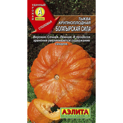 Столовый сорт с плодами высокого качества. Среднеспелый, от всходов до уборки 100-110 дней. Растения длинноплетистые. Тыквины массой 4-6 кг, максимально – до 15 кг. Мякоть хрустящая, толстая, сочная. Семена крупные, белые. Плоды лежкие, хранятся до четырех месяцев.