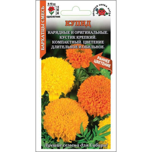 Низкорослые бархатцы с оригинальными хризантемовидными соцветиями. Кусты компактные, ветвистые, крепкие, высотой 20-25 см, с большим количеством цветоносов. Соцветия-корзинки густомахровые, крупные, 07-9 см. Цветение раннее, очень обильное и продолжительное, с июня до заморозков. Растения неприхотливые, засухоустойчивые, тепло- и светолюбивые, хорошо растут в маленьком объеме земли. Отлично подходят для выращивания в горшках и балконных ящиках, прекрасно смотрятся на клумбах и в бордюрах.
