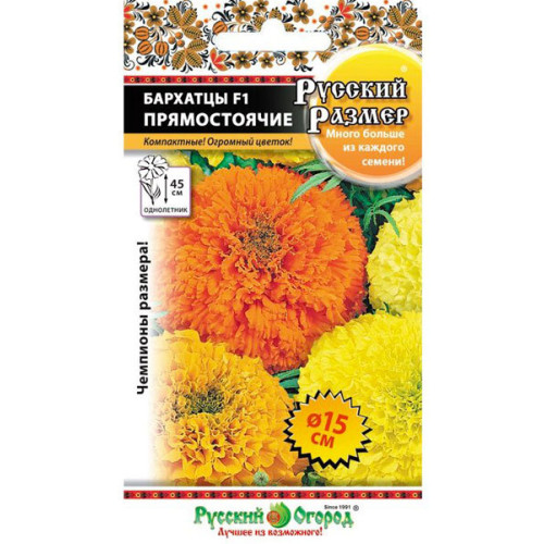Бархатцы прямостоячие Русский Размер Смесь - разнообразный набор превосходных декоративных цветочных растений с шаровидными, огромными соцветиями. Прямостоячие цветы, относятся к семейству Сложноцветные. Относятся к классу американских тагетесов, эти растения настоящие чемпионы по величине соцветий, некоторые из которых в диаметре достигают более десяти сантиметров! С момента посадки семян в землю и «проклёвывания» всходов до появления первых соцветий проходит всего два с половиной месяца. Поэтому если Вы хотите получить как можно раньше восхитительные цветы, то рекомендуется ранний посев. Если погодные условия Вашей зоны не располагают к такому, то растения смело можно посеять в теплице, а потом просто пересадить на постоянное место