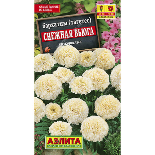 Новые белые бархатцы! На сегодняшний день это самые ранние из белых. Расцвета-ют на 3-5 дней раньше, чем Ванилла и Эскимо. К тому же габитус растений в группе более выравненный, однородный. Компактные кусты высотой всего 35 см имеют густую насыщенно-зеленую листву. На фоне темной зелени белые густомахровые соцветия 6-8 см смотрятся особенно ярко и контрастно. Аромат нежный, мягкий,не такой интенсивный и резкий, как у желтых и оранжевых бархатцев. Сорт рекомендуется для оформления низких бордюров в садовых цветниках, балконных ящиков,мобильных кашпо.