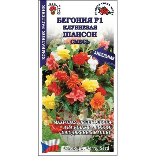 Великолепная ампельная бегония с махровыми и полумахровыми цветками ярких оттенков. Длинные свисающие побеги, окутанные облаком камелиевидных соцветий, образуют пышный цветочный каскад. Ампельная бегония особенно хороша на возвышенных местах, в вазонах и подвесных горшках – везде, где подчеркивается свисающая форма растений. Цветет обильно и длительно