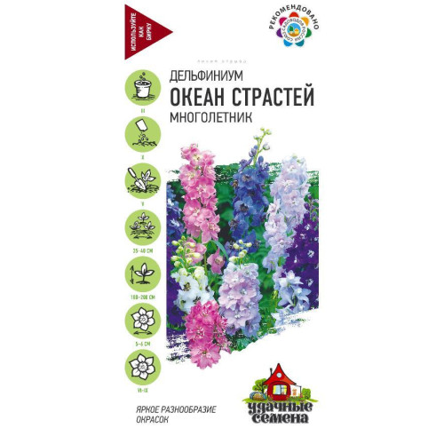 Многолетнее растение высотой до 2 м с плотными кистевидными соцветиями из розовых, темно-фиолетовых, синих, голубых, чисто-белых цветков. Цветет в июне-июле, вторичное цветение – в августе-сентябре, отцветшие соцветия обрезают для полноценного второго цветения. Хорошо растет на освещенных участках с легким затенением в полуденные часы. Предпочитает плодородные суглинистые и супесчаные, умеренно влажные почвы. Используются в групповых и одиночных посадках, для получения срезки. Все части дельфиниума ядовиты!