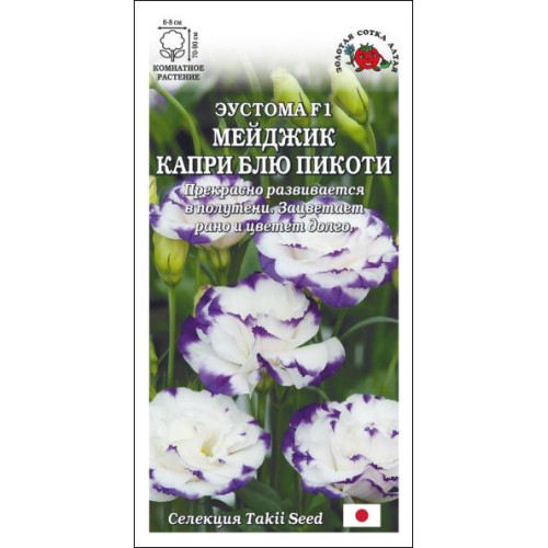 Модное растение, покорившее сердца флористов и садоводов. Выращивается круглогодично в оранжереях или в саду как однолетник. Прямостоячий куст с крепкими высокими побегами несет целый ворох бутонов. Крупные супермахровые цветы образованы белоснежными лепестками с темно-синими мазками по краям. Эустомы «Super Magic» прекрасно растут в полутени, отличаются ранним и длительным цветением, долго стоят в вазе, сохраняя свежий вид