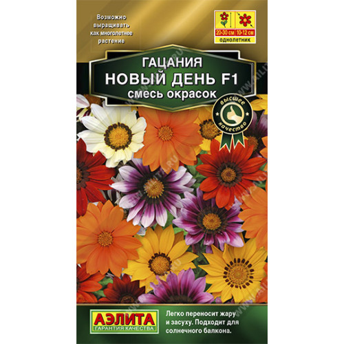 Гибриды гацании НОВЫЙ ДЕНЬ F1 имеют компактную, густую розетку серебристых листьев высотой 20-30 см. Цветение продолжительное – с июля до поздней осени. Крупные (10-12 см) эффектные соцветия, в центре которых жёлтую серединку окантовывает шоколадный браслет, напоминают «павлиний глаз». Цветы пригодны для срезки. Гибриды НОВЫЙ ДЕНЬ F1 отлично подходят для выращивания в контейнерах на балконе и в саду, в альпинариях, в цветниках различных типов. Гацания предпочитает солнечные сухие участки с дренированной, легкой, питательной почвой, хорошо реагирует на подкормки; засуху и жару переносит легко - идеально подойдет для цветника у южной стороны дома. Для увеличения продолжительности цветения осенью гацанию пересаживают в вазоны и заносят в дом. Чтобы сохранить гибрид до следующего сезона, его можно поставить в светлом прохладном помещении (+8+10°С).