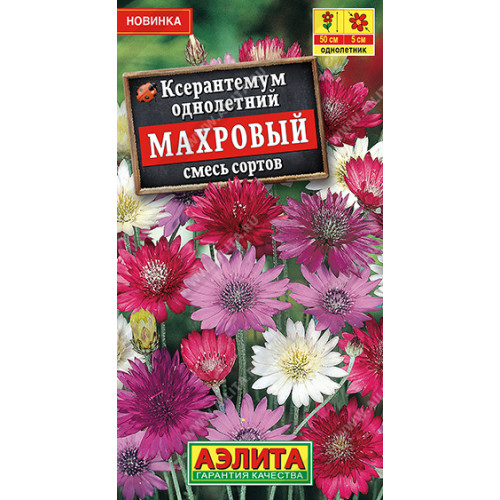 Привлекательный однолетник с махровыми, полумахровыми и простыми чешуйчатыми соцветиями ? 3-5 см. Ксерантемум – один из самых изящных и красивых сухоцветов. Прекрасно выглядит в садовых клумбах, позволяет создавать интересные цветочные букеты. Растения высотой около 30-50 см. Стебли и листья с необычным войлочным опушением. Самую качественную срезку можно получить в августе. Цветоносы срезают в период начала роспуска бутонов, подвешивая и просушивая их пучками в затененных помещениях.