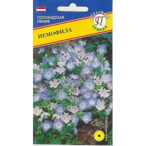 Немофила представлена стелющимся растением высотой около 15 см. Цветки одиночные белого цвета с синими пятнами по канту лепестков и нежно-голубым с белым центром, диаметр - 4 см. Цветение приходится на июнь-сентябрь. Немофилу Микс применяют в качестве почвопокровного растения для посадки в миксбордеры. Отличается холодостойкостью, любит рыхлый, питательный грунт и полутень