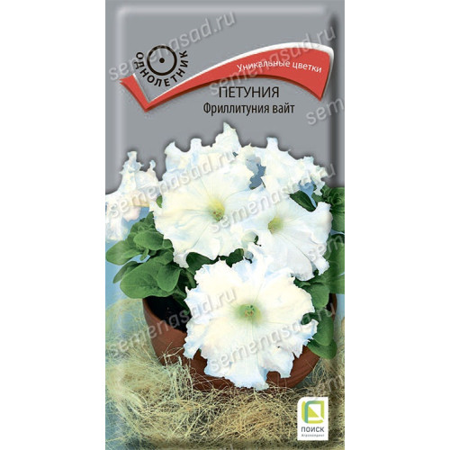 Уникальный цветок современной гибридной петунии. Мощный густоветвистый куст высотой 30 см. Эффектные воронковидные белые цветы, диаметром 8-9 см, края лепестков волнистые, бахромчатые. Цветет обильно с июня по октябрь. Используют в клумбах для ярких групп, на бордюрах, рабатках, в подвесных корзинках.