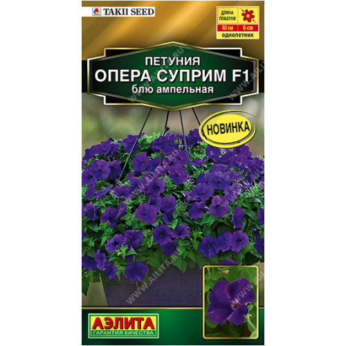 Премиальная серия роскошных ампельных петуний «Opera Supreme F1» от японской компании Takii. Гибриды малочувствительны к длине светового дня, отличаются сильной энергией роста, чрезвычайно обильным цветением, очень красивой формой образующихся каскадов. В разгар лета каждый побег целиком покрыт множеством цветков диаметром 5-6 см. Кусты обладают раскидистым габитусом: высота не более 10-20 см, длина побегов 50-60 см. Растения украсят подвесные кашпо, высокие садовые вазоны. Отлично подходят для почвопокровной культуры. Важно: петунии сохраняют декоративный облик и насыщенность окрасок после дожде.