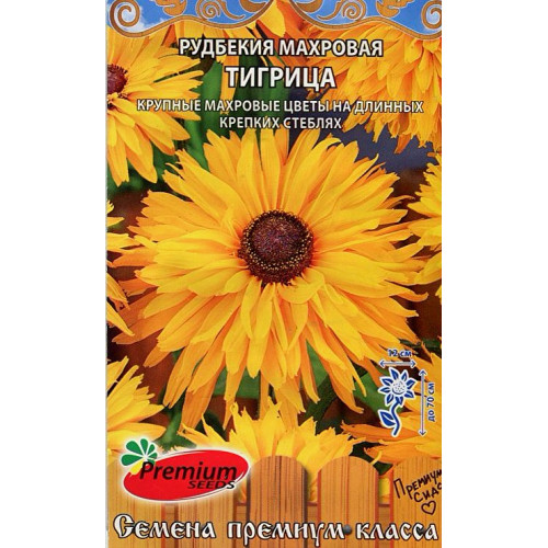 Рудбекия махровая Тигрица Rudbeckia hirta Впечатляющий сорт рудбекии на высоких прочных стеблях с роскошными, золотисто-желтыми махровыми и полумахровыми крупными (до 12 см) цветками с большими черными центрами. Длительное и обильное цветение и высокие крепкие стебли высотой 70 см делают его прекрасным выбором для срезки. Незаменим как яркий акцент на клумбе и для букетных композиций