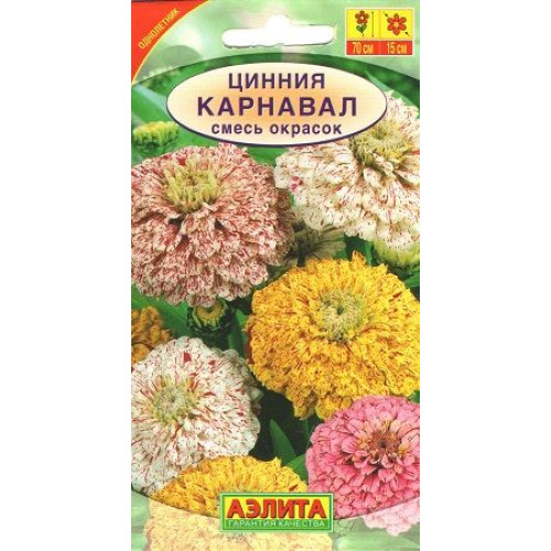 Однолетник Высота растения 70 см Диаметр соцветия 15 см. Великолепное быстрорастущее растение с прямостоячими стеблями. Тем кто предпочитает ' что-нибудь особенное', предлагаем сорт циннии, которая уже одной своей пестрой окраской способна расставить в саду необычные акценты. Она цветет обильно и продолжительно. Используется для срезки, посадки в цветники, на клумбы. Хорошо сочетается с ноготками, бархатцами, вербеной. Посев: март-апрель на рассаду. Через 3-4 недели после всходов сеянцы пикируют. В открытый грунт рассаду высаживают, когда минует угроза заморозков. Расстояние между растениями 40 см. Предпочитает солнечные, защищенные от ветров, теплые участки с дренированной, нейтральной, богатой гумусом и минеральными элементами почвой. Уход: При продолжительной засухе требуется полив.Циннию подкармливают каждые 2-4 недели. Цветение: с июля до заморозков. Регулярное удаление увядших соцветий способствуют более пышному цветению. Цинния хорошо сочетается с ноготками, бархатцами, мелкоцветковыми хризантемами, вербеной.
