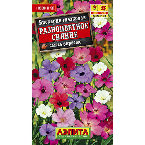 Обильно цветущий летник из семейства Гвоздичных. Смесь цветет в июле–сентябре и включает четыре окраски: белую, красную, сиреневую и розовую – по 25%. Кусты прямостоячие, многостебельные, до 50 см высотой. Стебли сильно ветвятся. Простые пятилепестковые цветочки Ø 2-3 см собраны в рыхлые метельчатые соцветия. Огромная масса цветов буквально образует разноцветные облака над посадками. За красоту цветения растение получило название «небесная роза». Вискария красиво смотрится массивами. Используется для объемного наполнения цветников вместе с другими летниками.